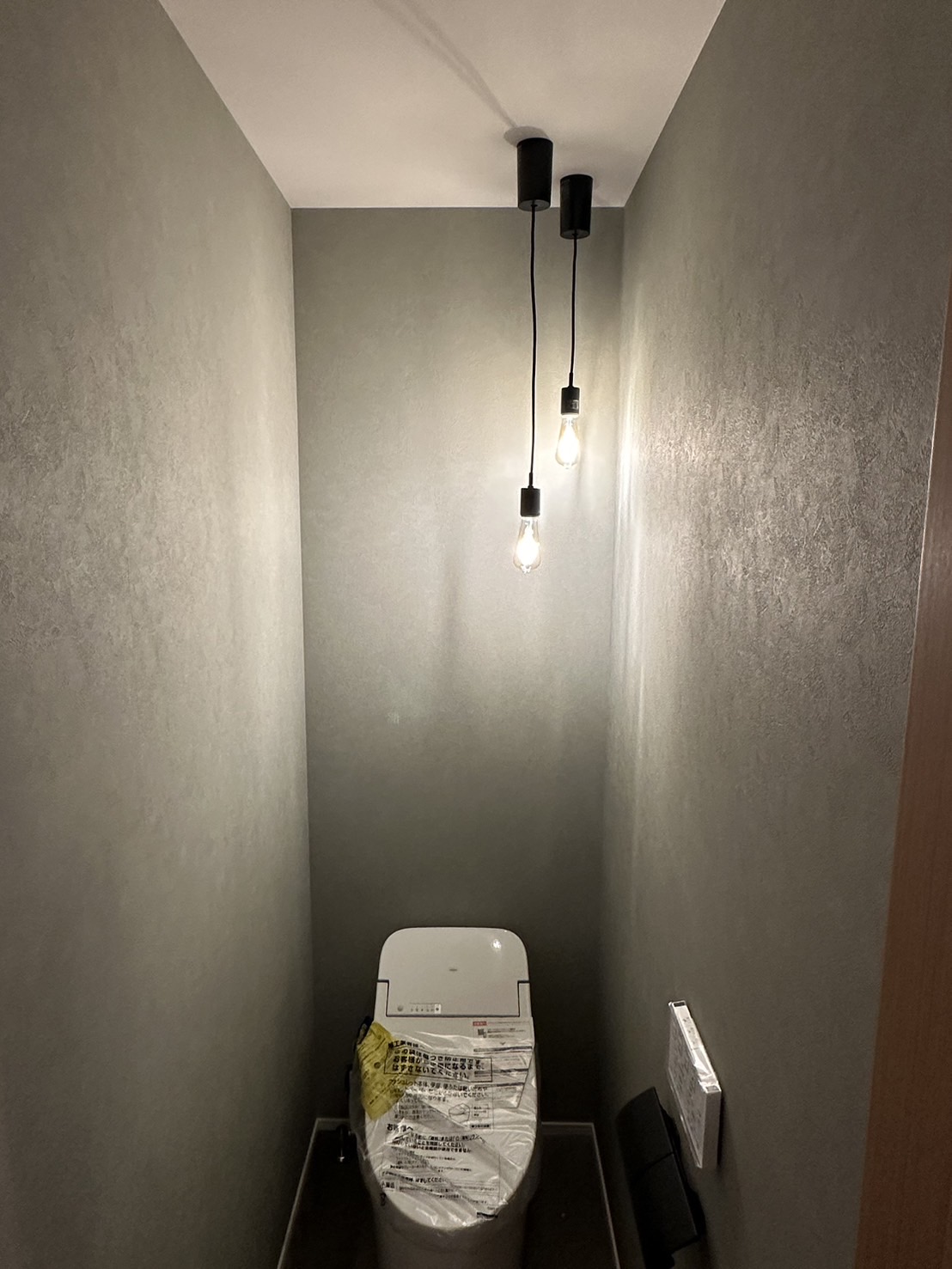 今回K様邸では、間接照明やペンダントライトとの相性も考え、空間全体に統一感を持たせたコーディネートに仕上げました。グレー系クロスはトイレ空間を狭く感じさせない上、落ち着きと高級感も演出。モダンテイストはもちろん、北欧風・インダストリアルデザインにもぴったりです。