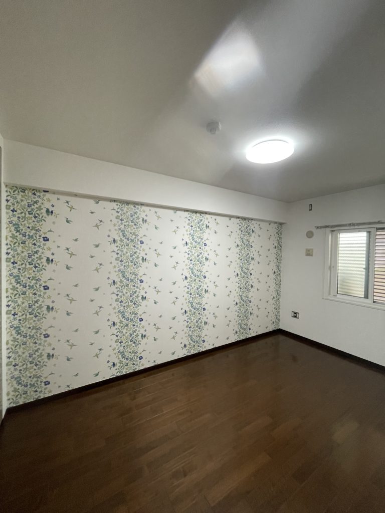 施工箇所はお部屋の一面で、アクセントクロスとしてデザイン性を引き立たせました。白地に繊細なグリーンとブルーの植物柄が映えることで、シンプルになりがちな室内に彩りと立体感が生まれました。
