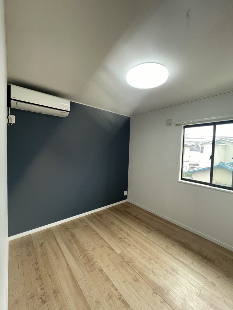 ご採用いただいたのは、サンゲツの人気クロス「SP9796」。深みのあるネイビーが印象的で、シンプルながらも空間に高級感と落ち着きを与えるデザインです。主に寝室や書斎に選ばれることの多いカラーですが、今回のようにエアコン背面の壁一面に使うことで、スタイリッシュかつバランスの取れたインテリアが完成しました。