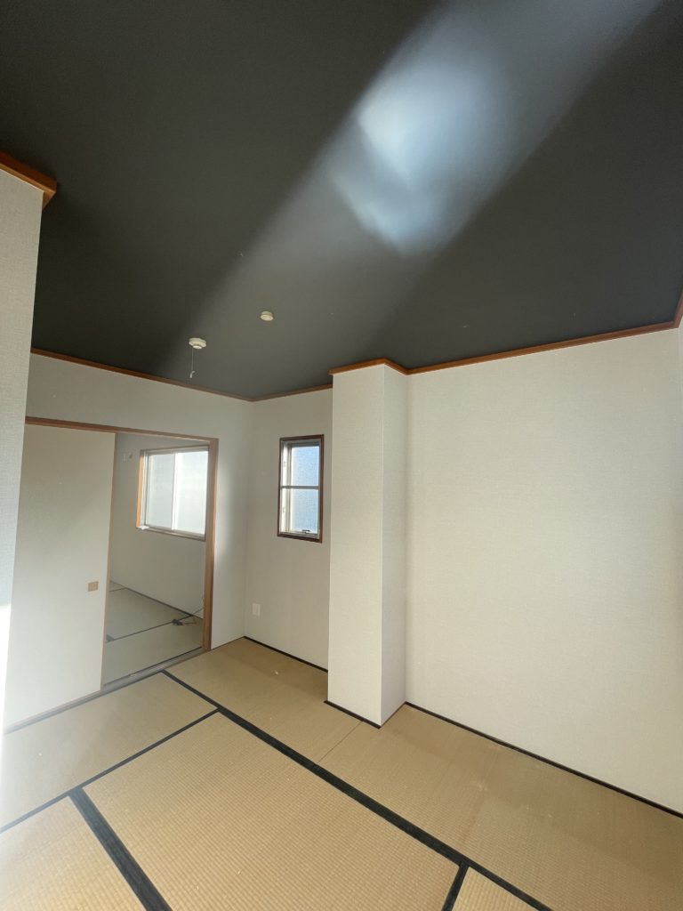 畳との相性も良く、黒の天井は和の趣を引き立てながら、現代的なモダンさも感じさせます。自然光や照明の光が柔らかく反射し、重くなりすぎず、落ち着いた空間に仕上がっています。